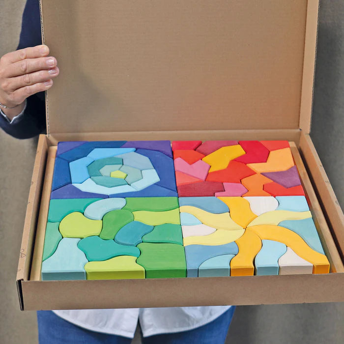 • Grimm’s Vier Temperamente Bauklötze: 61 bunte, organisch geformte Holzbausteine in vier Farbbereichen für fantasievolles Spielen