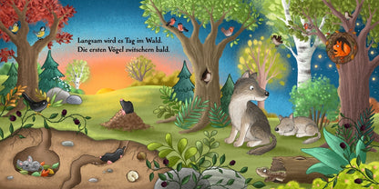 Mit der aufgehenden Sonne erwacht der Wald zum Leben. Vögel zwitschern, Hasen hüpfen durch den Klee, das müde Reh steht auf und der kleine Bär kommt aus seiner Höhle. Nur die Fledermausfamilie ruht sich noch aus. Allererstes gereimtes Sachwissen über den Tag im Wald.