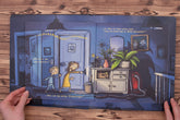 Doch da ist nichts zu sehen. Mit Taschenlampe und jeder Menge Mut bewaffnet geht die Suche nach dem seltsamen Geräusch nun los. Zuerst im Badezimmer: Als die Kinder das Licht anschalten, hängt da aber nur der Regenmantel in der Badewanne. Und auch in der Küche entpuppen sich die gruseligen Schatten nur als Herd und Spüle. Wo kommen die nächtlichen Geräusche dann her?