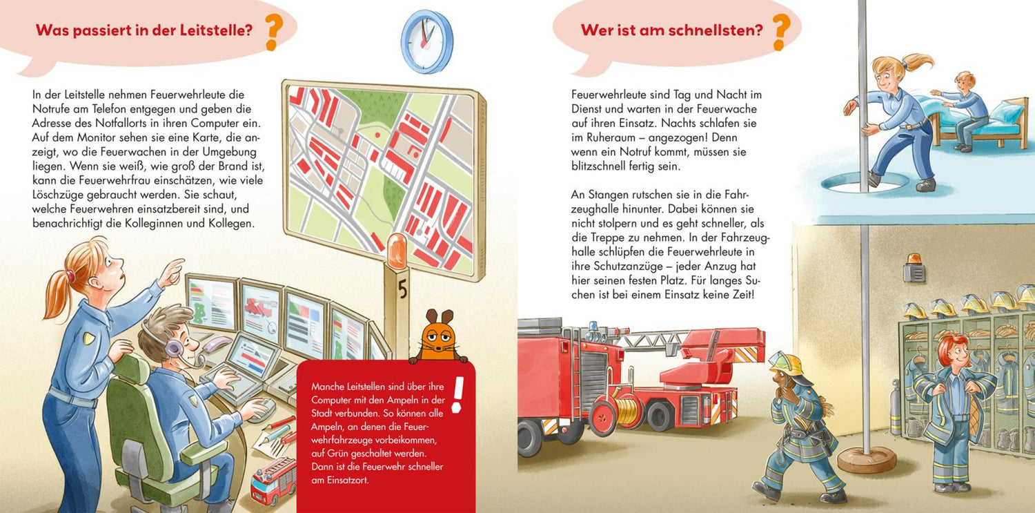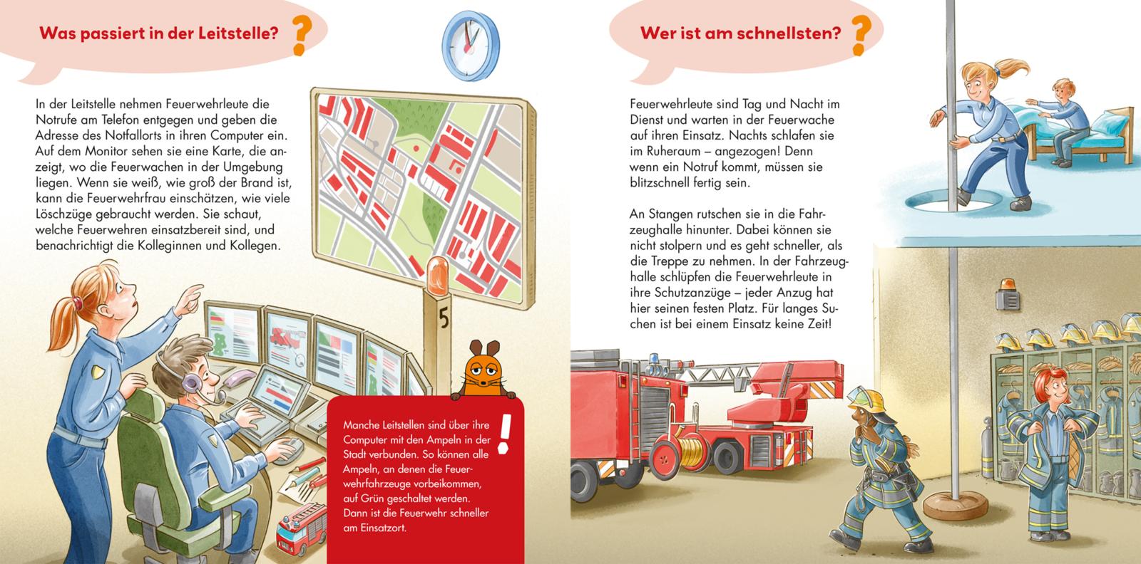 Was ist ein Löschangriff? Wie wird ein Waldbrand gelöscht? Und was haben Feuerwehrmann und Feuerwehrfrau im Einsatz an? Die Maus kennt die Antwort auf jede Frage! In diesem Mitmachbuch begleitet sie die Feuerwehrleute vom ersten Notruf über die Auswahl des richtigen Feuerwehrautos bis hin zum erfolgreichen Löscheinsatz. Dabei hat die Maus für alle Kinderfragen ein offenes Ohr und immer eine mausschlaue Antwort parat.