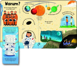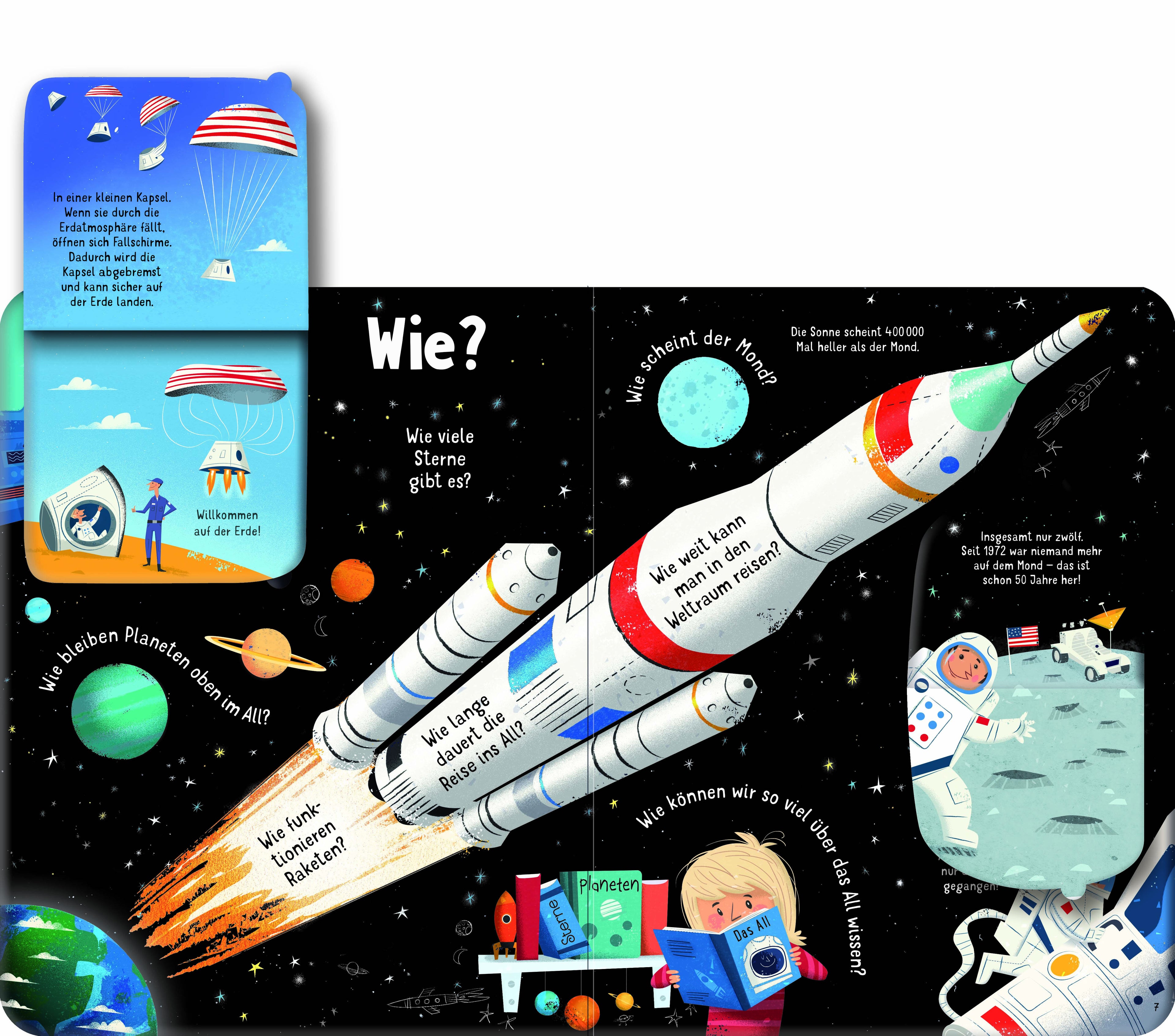 Wo gehen Astronauten zur Schule? Wie kehrt man aus dem Weltall zurück? Und was ist eine Galaxie? Unter 65 Klappen findest du die Antworten auf diese und viele weitere spannende Fragen zum Thema Raumfahrt.