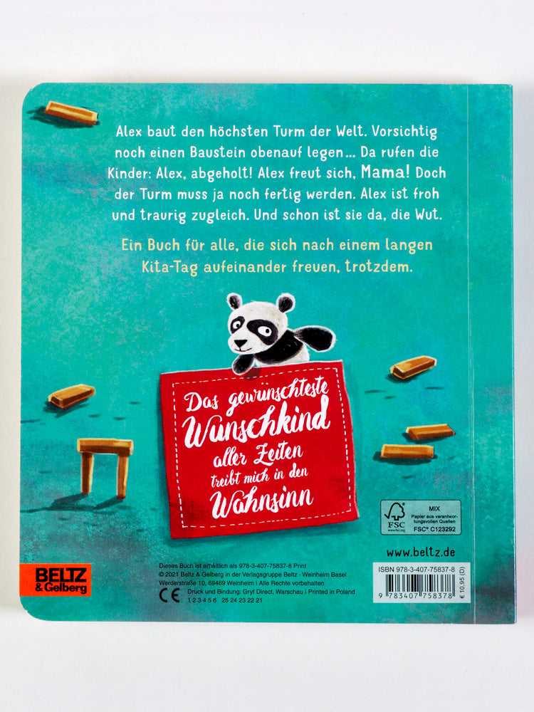 Alex hat sich den Bauklotz geangelt und kann den Turm nun noch höher machen. Vorsichtig obenauf legen ... Da rufen die Kinder: "Alex, abgeholt!" Alex freut sich: Mama! Doch der Turm muss ja noch fertig werden. Warum kommt Mama immer falsch? Alex ist froh und enttäuscht zugleich. Und schon ist sie da, die Wut. Alle Eltern von Kita-Kindern kennen das: Die Vorfreude auf den gemeinsamen Nachmittag ist groß – und dann sowas! Warum das Abholen manchmal mächtig schiefgeht, zeigt dieses Bilderbuch bedürfnisorientiert, alltagsnah und ehrlich.