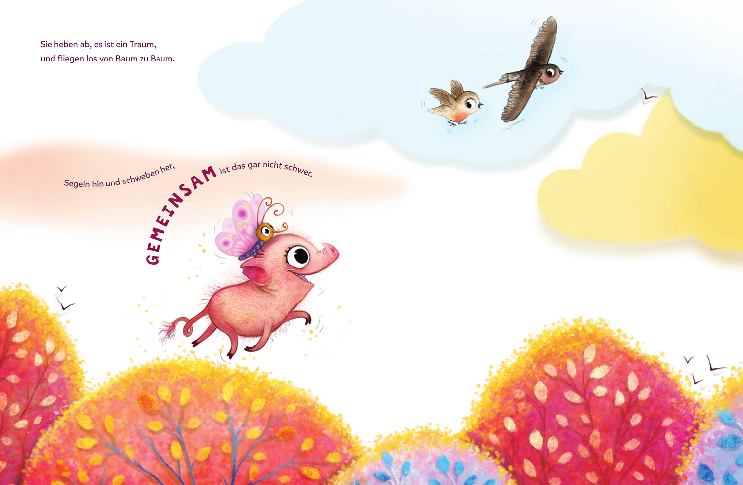 Rosa ist sie, Rosalein, mit Ringelschwanz und etwas klein. Rosalein hat einen Traum. Sie will fliegen, hoch oben am Himmel. Doch wie soll das gehen, so ohne Flügel? Ihre Freunde lachen sie aus. Sie ist nun mal ein Schwein, und kein Vogel. Das klappt doch nie! Aber Rosalein wünscht es sich so sehr und gibt nicht auf und übt und übt. Ihr bester Freund Bo, der Schmetterling, glaubt fest an sie. Gemeinsam und mit einem Schuss Magie wird das kleine Wunder wahr!