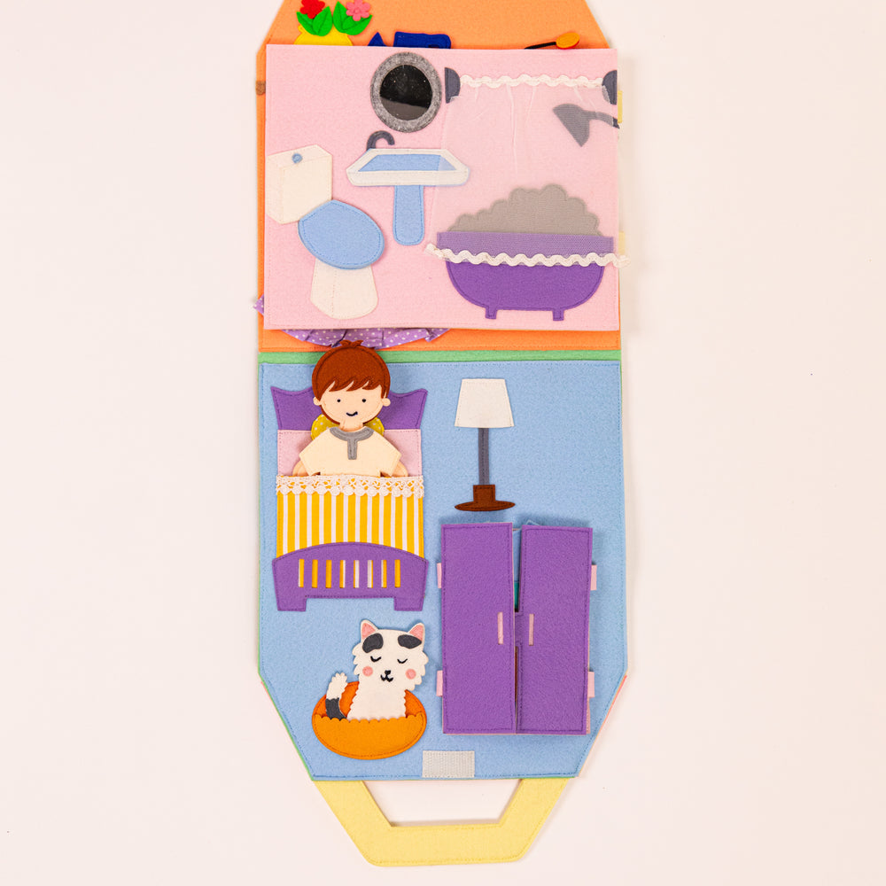 Willkommen im Travel Buddy Puppenhaus. Die liebevoll gestalteten Räume laden zu einem fantasievollen Rollenspiel ein. Die 3 Fingerpuppen begleiten durch Alltagssituationen und bringen Freude und Spielspaß.