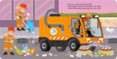 Weißt du, wie die Müllabfuhr klingt? Oder die Straßenkehrmaschine? In diesem Buch kannst du es entdecken. Begleite den Motorradfahrer bei seinem Ausflug und hilf den Straßenkehrern bei ihrer Arbeit. Schalte die Fahrzeuge und das Blinklicht ein und winke den Leuten in der Straßenbahn zu, bediene die Fahrradklingel und hör, wie die Polizeisirene klingt.