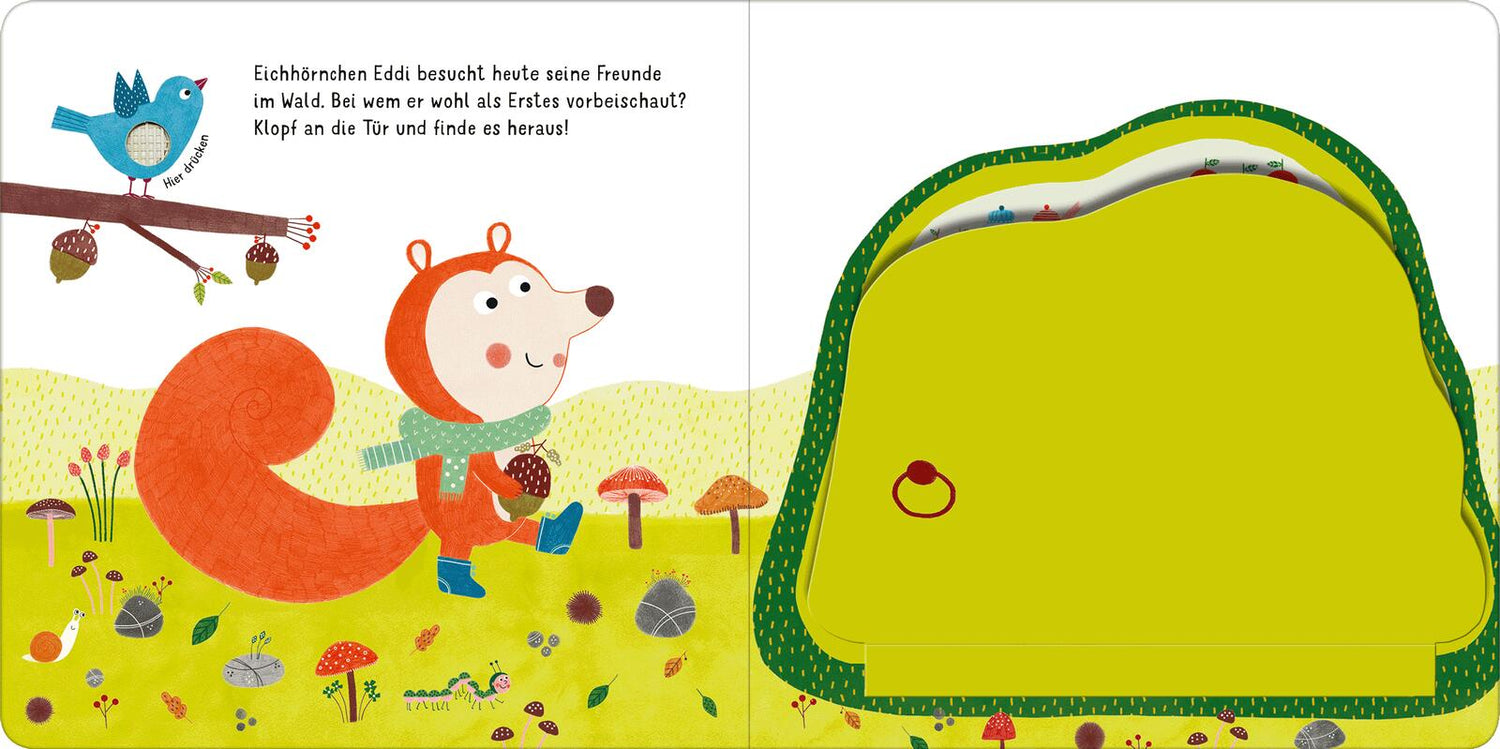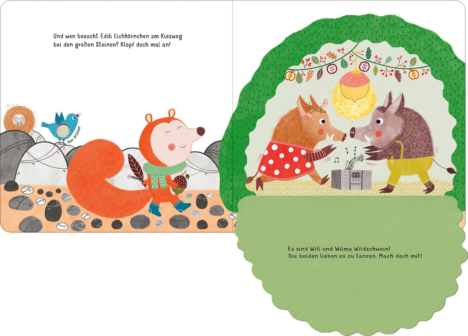 Eichhörnchen Fido hüpft fröhlich durch den Wald. Seine Freunde, der Igel, die Füchse, der Bär, die Eulenkinder und die Wildschweine, sind alle zu Hause in ihren Höhlen. Was sie wohl gerade machen? Begleite Fido auf seinem Waldausflug und finde es heraus. Klopf laut an die Türen und hör genau! Kannst du erraten, wer sich dahinter verbirgt?