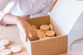 Enthalten sind 60 Münzen mit gestanzten Zahlen von 0 bis 9 ein Stoffbeutel mit GOTS-zertifiziertem Stoff.