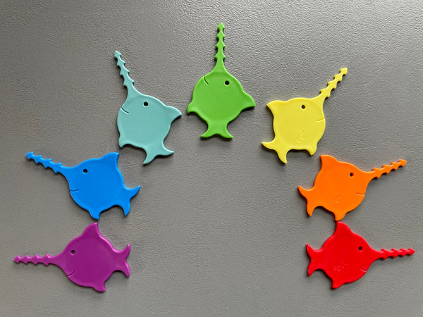 Das "Sägebogen" -Set beinhaltet 7 gleich große Pieksis (🐟 Sägefisch) in den leuchtenden Farben des Regenbogens: Hell-Lila, Blau, Türkis, Grün, Gelb, Orange und Rot.
