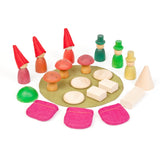 Enthalten sind 6 Nins®, 3 Nins mit Zylinder, 3 kleine Filzsäcke, 3 Filzhauben, 1 Filzkreis, 1 Halbkugel, 1 Kegel, 3 Pilze, 3 Münzen, 2 kleine Balken und 1 großer Balken. Es beinhaltet eine Textiltasche mit GOTS-zertifiziertem Stoff.