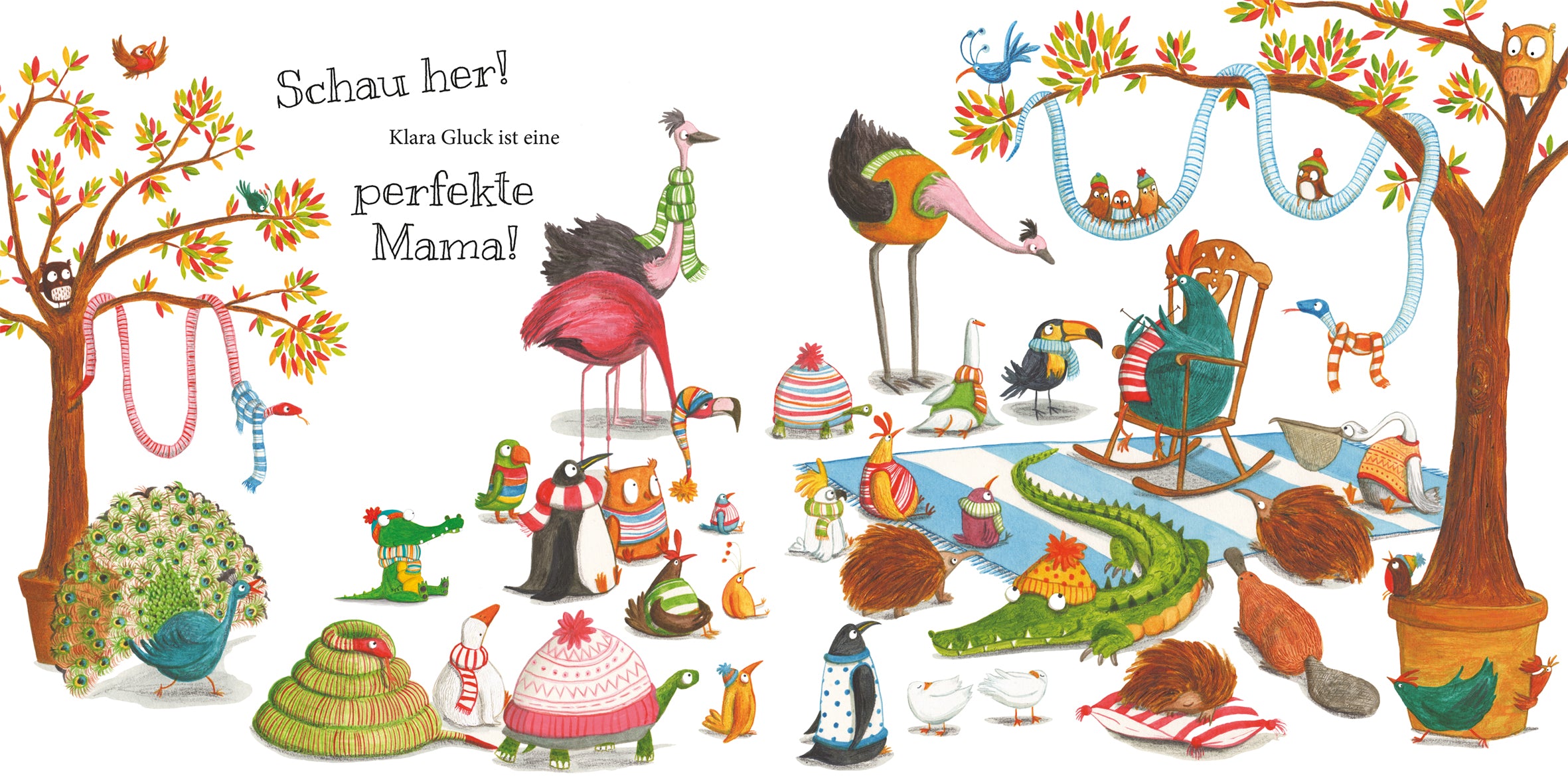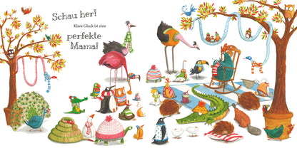 Klara Gluck ist traurig. Aus ihrem einzigen Ei ist kein Küken geschlüpft. Aber Klara gibt nicht auf: Sie beschließt, alle verwaisten Eier dieser Welt zu adoptieren. Die Suche beginnt! Ihre abenteuerliche Reise führt sie über das weite Meer, von Dorf zu Dorf, durch riesige Städte, über Berge und Täler und durch dunkle Höhlen. Sie überwindet Feuer, Sturm und Eis – und sie findet viele Eier, in allen Größen und Farben! Wieder daheim beginnt Klara Gluck, den großen Eierberg auszubrüten. Und endlich ist es so weit, die Eier knacken und krachen und gehen auf und Klara Gluck staunt nicht schlecht, was da so alles schlüpft ...